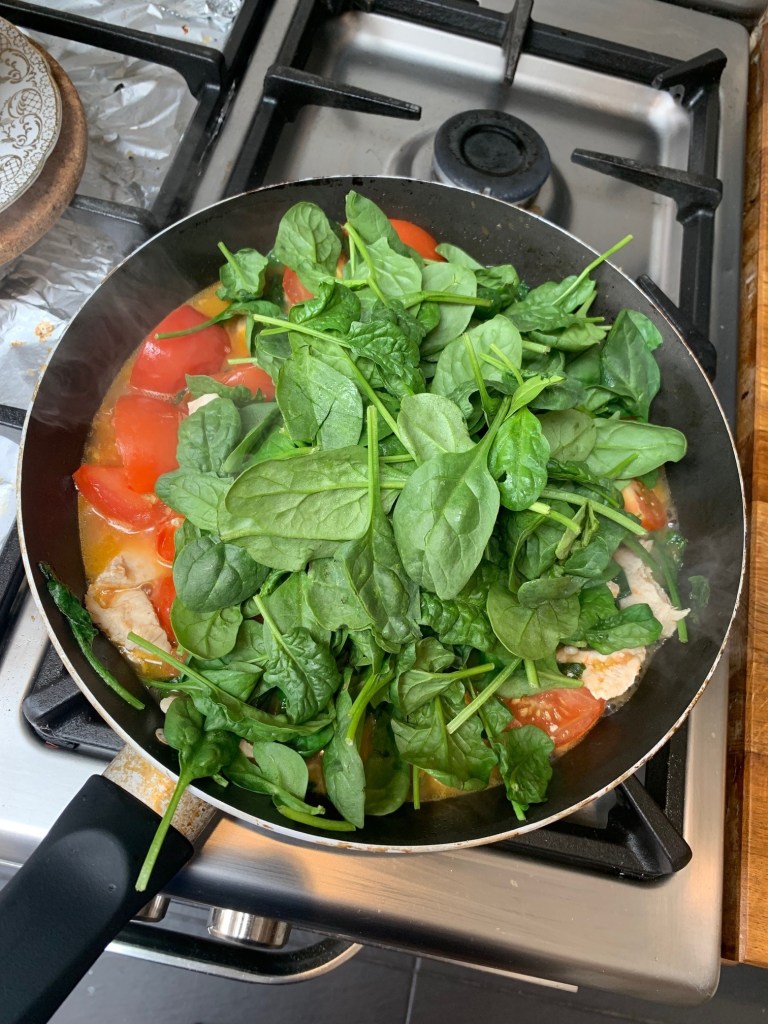 - Chicken, Tiny bit of peanut butter, Tiny bit of curry powder, Broccoli and Red pepper